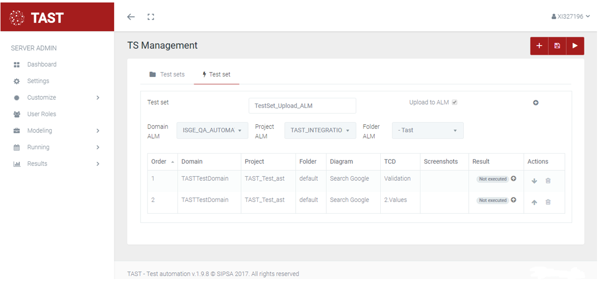 La integración de ALM está vinculada con el equipo de prueba TAST. Una vez que la integración de ALM se configura a través del archivo de propiedades de la aplicación, TAST verificará la disponibilidad de ALM mientras se carga la página Gestión de TS. Si la verificación es correcta, el usuario podrá configurar el dominio, proyecto y carpeta ALM, donde TAST cargará los resultados y las evidencias, durante el proceso de creación / edición de los Casos de Prueba.