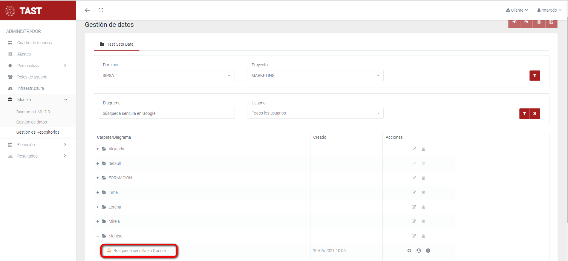 Esta opción de la herramienta TAST permite al usuario administrar diagramas UML. También podrá gestionar los datos y gestionar los repositorios de los casos de prueba que se diseñen.