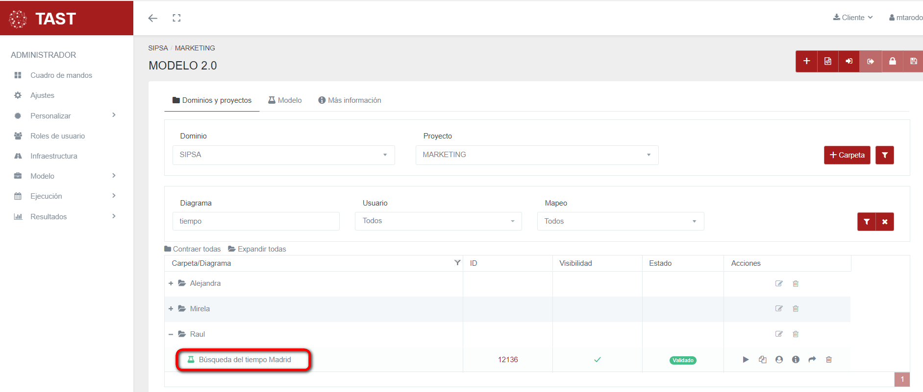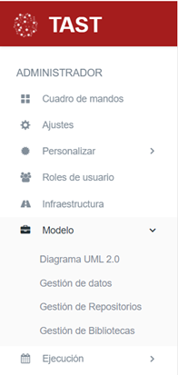 Cuando haya iniciado sesión en la herramienta, el usuario puede ver un menú en el lado izquierdo (consulte First steps in TAST para obtener más información). En este menú, el usuario hará click en el botón “Modelo”.