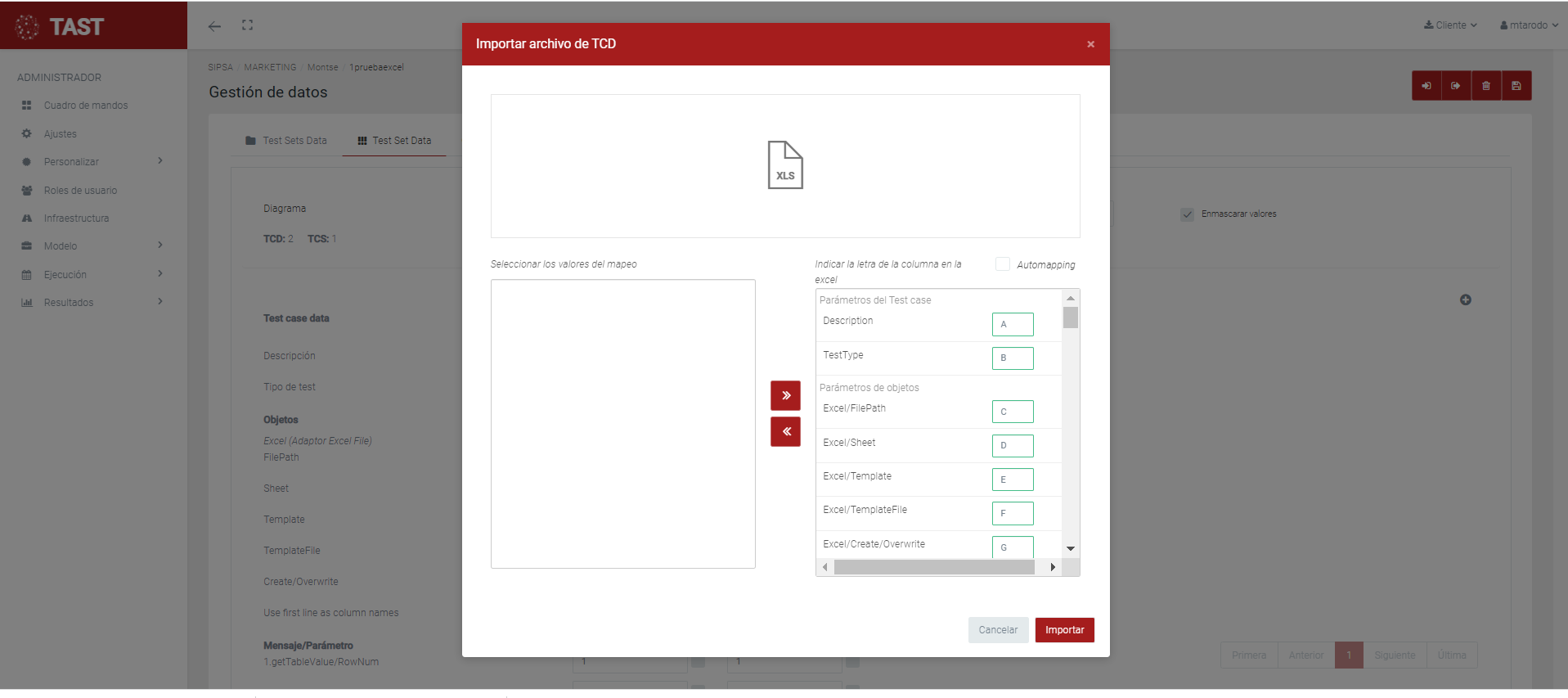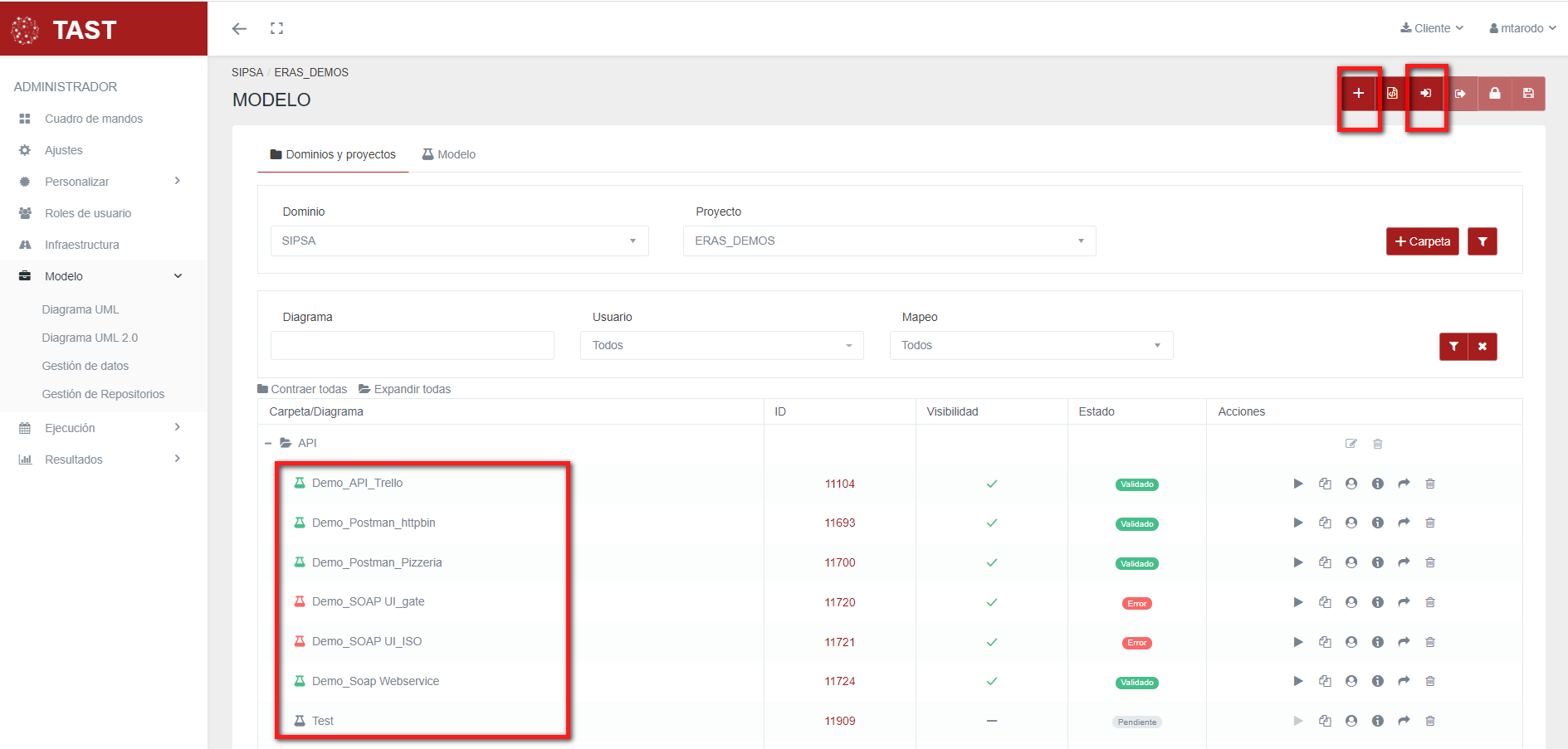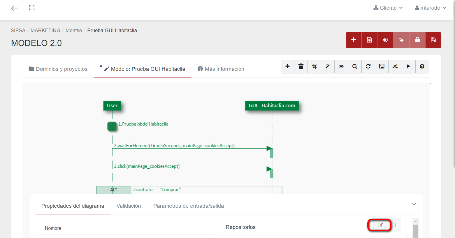 • Si el usuario elige importar un caso de prueba ya creado, pulsará el botón de “Importar” que está cerca del botón de “Nuevo diagrama”.
