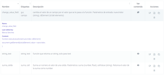 Pulsando el botón Editar contenido de la columna Acciones se accede directamente al editor de código, donde el usuario podrá modificar el código javascript o sql del ítem y salvarlo de nuevo. En esta acción se comprueba además que no haya ningún otro usuario que esté editando el contenido del ítem en ese mismo momento.