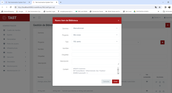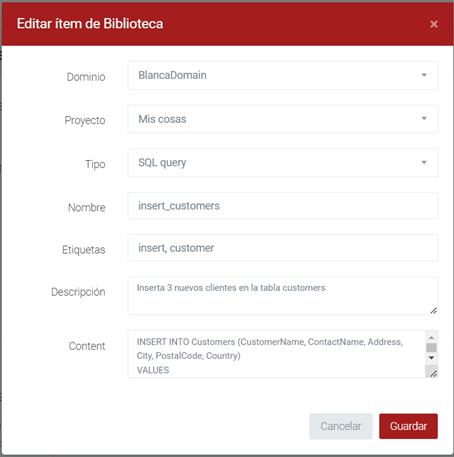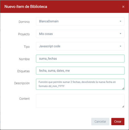 Pulsando el botón Nuevo ítem de biblioteca desde la ventana de edición de código Javascript/Sql de Modeling, que automáticamente lanzará la página Gestión de Bibliotecas en una nueva pestaña de su navegador, y con el formulario de Crear un nuevo ítem de biblioteca abierto y con los campos Dominio, Proyecto, Tipo y Contenido ya rellenos.