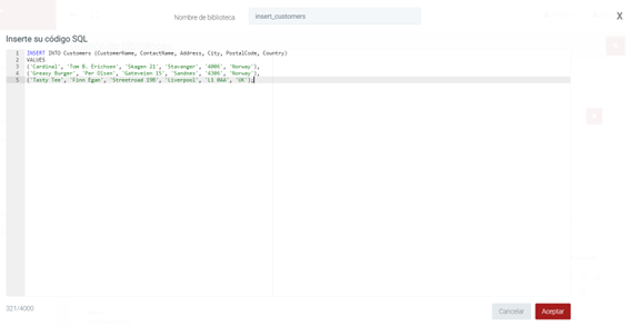Cuando un usuario está modelando un diagrama y editando el código javascript o sql de un mensaje, y le gustaría traerse el código desde alguna de sus bibliotecas, este sería el procedimiento: