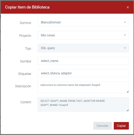 Pulsando el botón Copiar ítem de biblioteca de la columna Acciones aparece un formulario para poder copiar este ítem, por ejemplo en otro dominio o proyecto, y se permite modificar ciertos campos como Nombre, Etiquetas o Descripción.