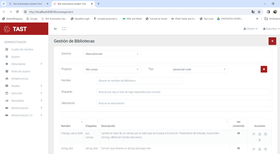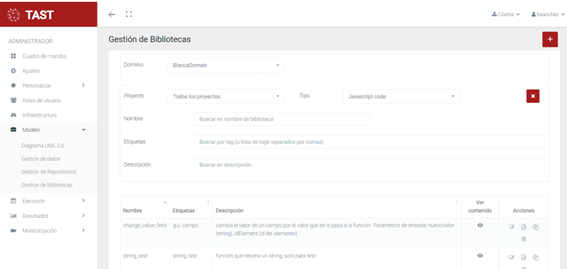 La Gestión de Bibliotecas proporciona a TAST y en concreto a la parte del modelado de diagramas, una herramienta para el manejo de bibliotecas, mediante la cual se puedan almacenar, organizar y consultar funciones javascript ó queries Sql, que el usuario considere que son de utilidad, por ejemplo para ser reusadas en los mensajes de otros diagramas.