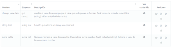 1. Las Columnas Nombre, Etiquetas y Descripción muestran los respectivos campos y pueden ser ordenables alfabéticamente.