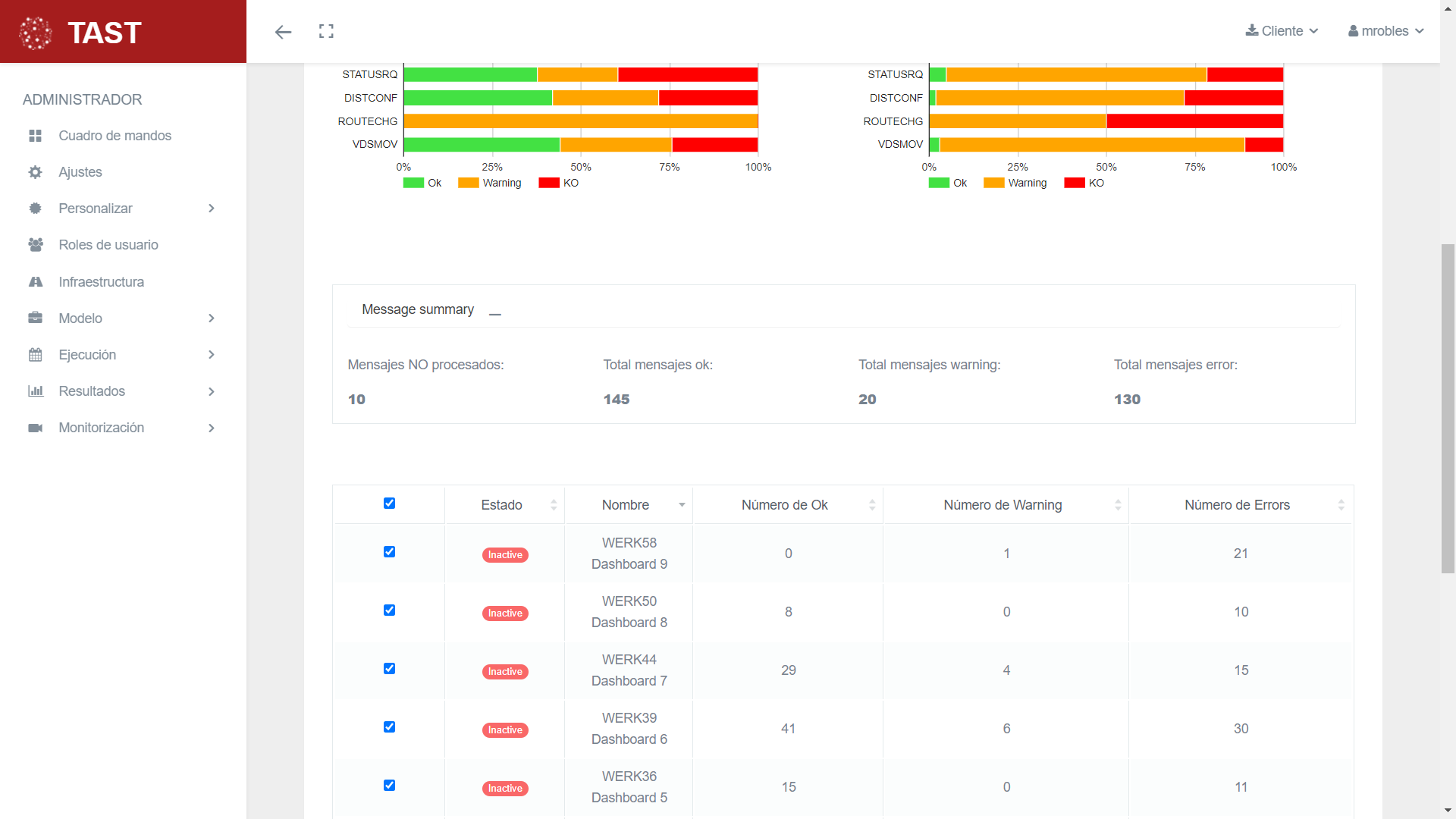 Debajo de los gráficos hay una caja que contiene el número total de mensajes no procesados, mensajes Ok, mensajes con aviso de validación y mensajes con error de validación. Estos valores dependen de los sistemas seleccionados.