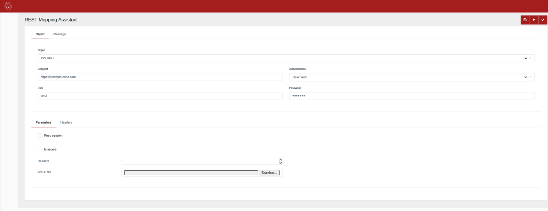 • Descripción: permite configurar el esquema de autenticación de las peticiones que se envían al EndPoint como BasicAuthentication. Sobrescribe la configuración de seguridad realizada en la configuración del adaptador.